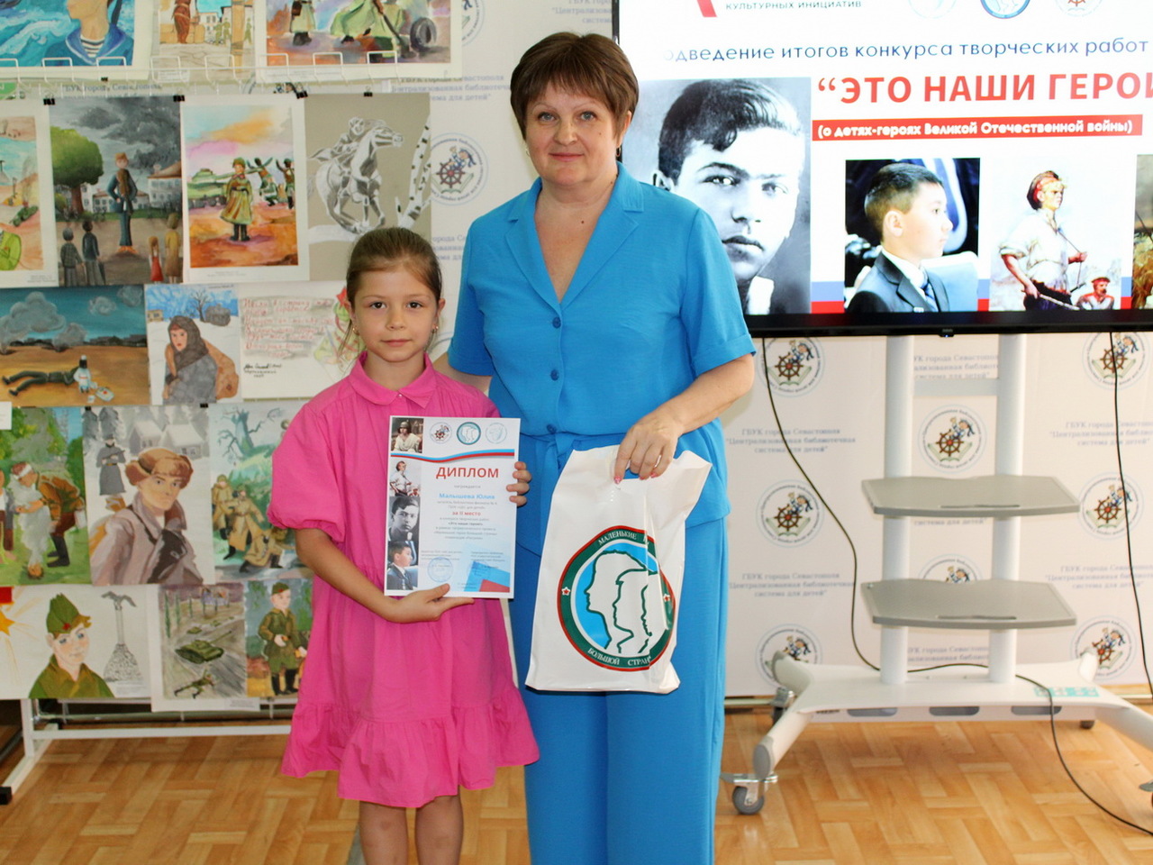 22 июня в Центральной городской детской библиотеке им. А. П. Гайдара состоялось награждение победителей второго Конкурса творческих работ «Это наши герои!», который проходил в рамках гражданско-патриотического проекта «Маленькие герои большой страны» при поддержке Президентского фонда культурных инициатив. Проект подготовлен Централизованной библиотечной системой для детей, РОО «Севастопольский городской Совет Женщин» и поддержан Департаментом культуры города Севастополя.