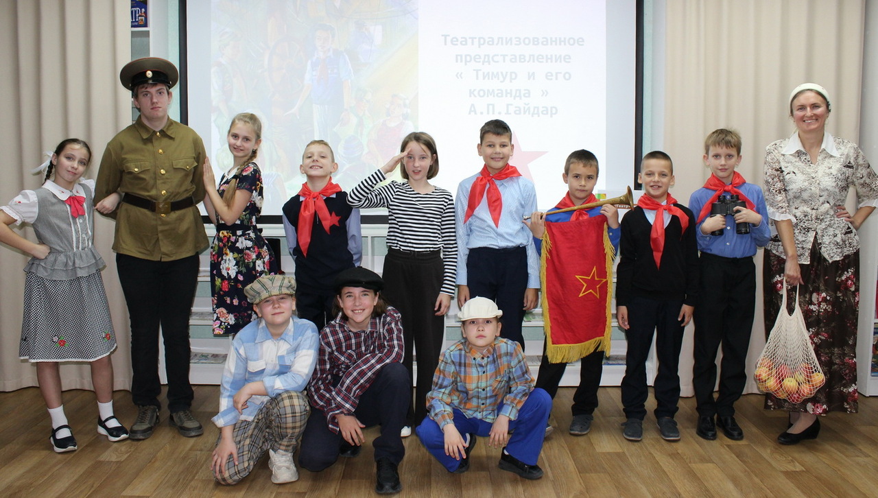 85 лет назад на свет появилась известная повесть Аркадия Петровича Гайдара «Тимур и его команда», а вместе с ней и понятие «тимуровские движения». В модельной детской библиотеке-филиале № 10 в рамках творческого проекта «Театр+Книга» артисты театра книги «Колокольчик» показали театрализованное представление по книге Гайдара.