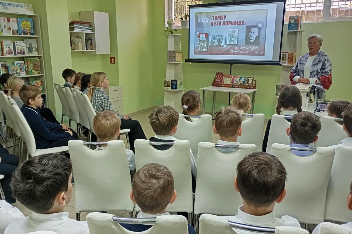 В детской библиотеке-филиале № 15 прошло обсуждение повести А. П. Гайдара «Тимур и его команда». Повесть была написана 85 лет назад, но по-прежнему волнует ребят. Всем нравится Тимур – смелый, добрый, честный, верный, решительный. Он любит Родину и готов приносить ей посильную помощь, а лидерские качества помогают ему объединить друзей. Читатели видят, что сплоченная команда, объединенная благородной целью, может добиться многого.