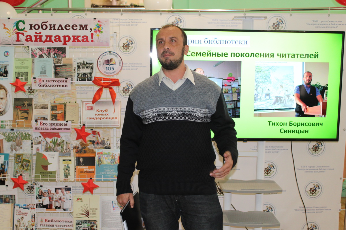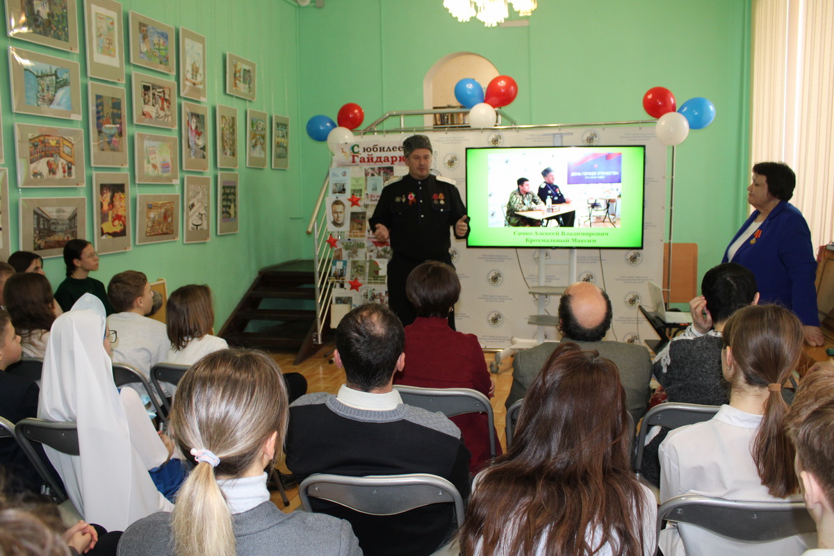 Завет Гайдара – беречь и защищать свою Родину, воплощают бывшие читатели, герои нашего времени: кавалер двух орденов Мужества Илья Подорога и волонтёр гуманитарных миссий Максим Крохмальный. Лично поздравить библиотеку пришёл Алексей Сачко, ветеран СВО, лектор российского общества «Знание».