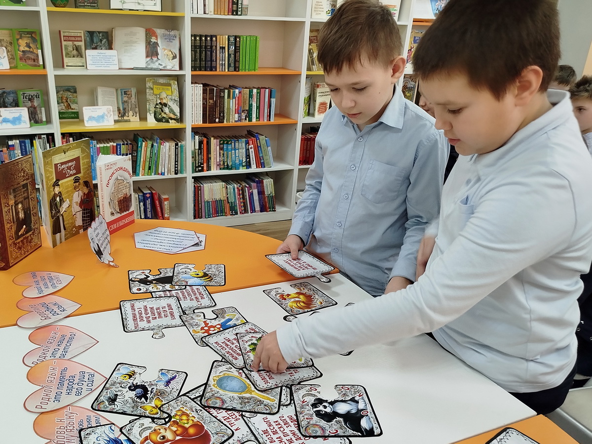 В модельной детской библиотеке-филиале № 13 прошло громкое чтение книги Марины Улыбышевой «Как Пушкин русский язык изменил». Юные читатели с увлечением слушали отрывки из книги, где рассказывается о роли Александра Сергеевича Пушкина в истории нашего языка, каким был русский язык до него. Ребята узнали, что Пушкин не просто писал стихи, он создал тот самый современный русский язык, на котором говорим мы с вами сегодня. Обсудили, почему важно беречь и уважать родной язык. Мальчишки и девчонки с увлечением выполняли интерактивные задания: вспоминали пословицы и поговорки, объясняли значение крылатых выражений, собирали пазлы с литературными загадками по сказкам А. С. Пушкина.