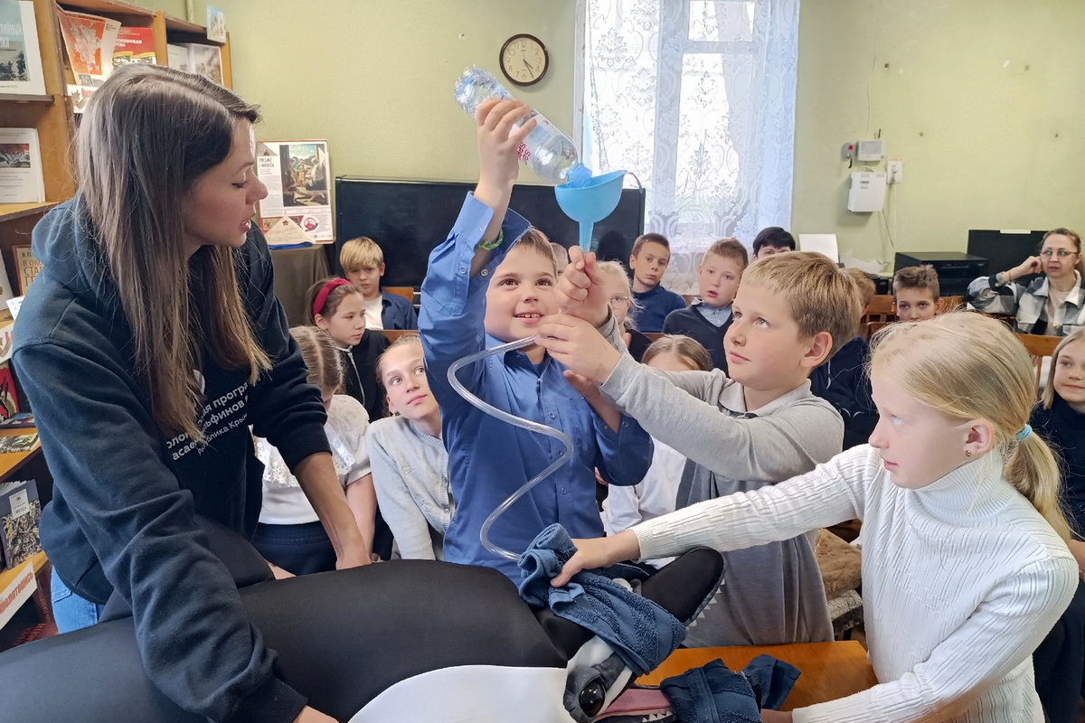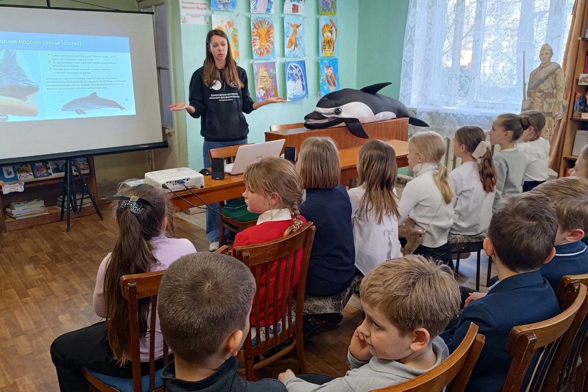 Елена Коновалова поделилась с участниками мероприятия своим опытом участия в спасательных операциях, помощи этим морским обитателям. Объяснила, почему дельфины выбрасываются на берег, какие угрозы их подстерегают и как правильно оказывать им первую помощь. Теперь участники проекта знают, что делать, если заметили выбросившегося на берег дельфина.